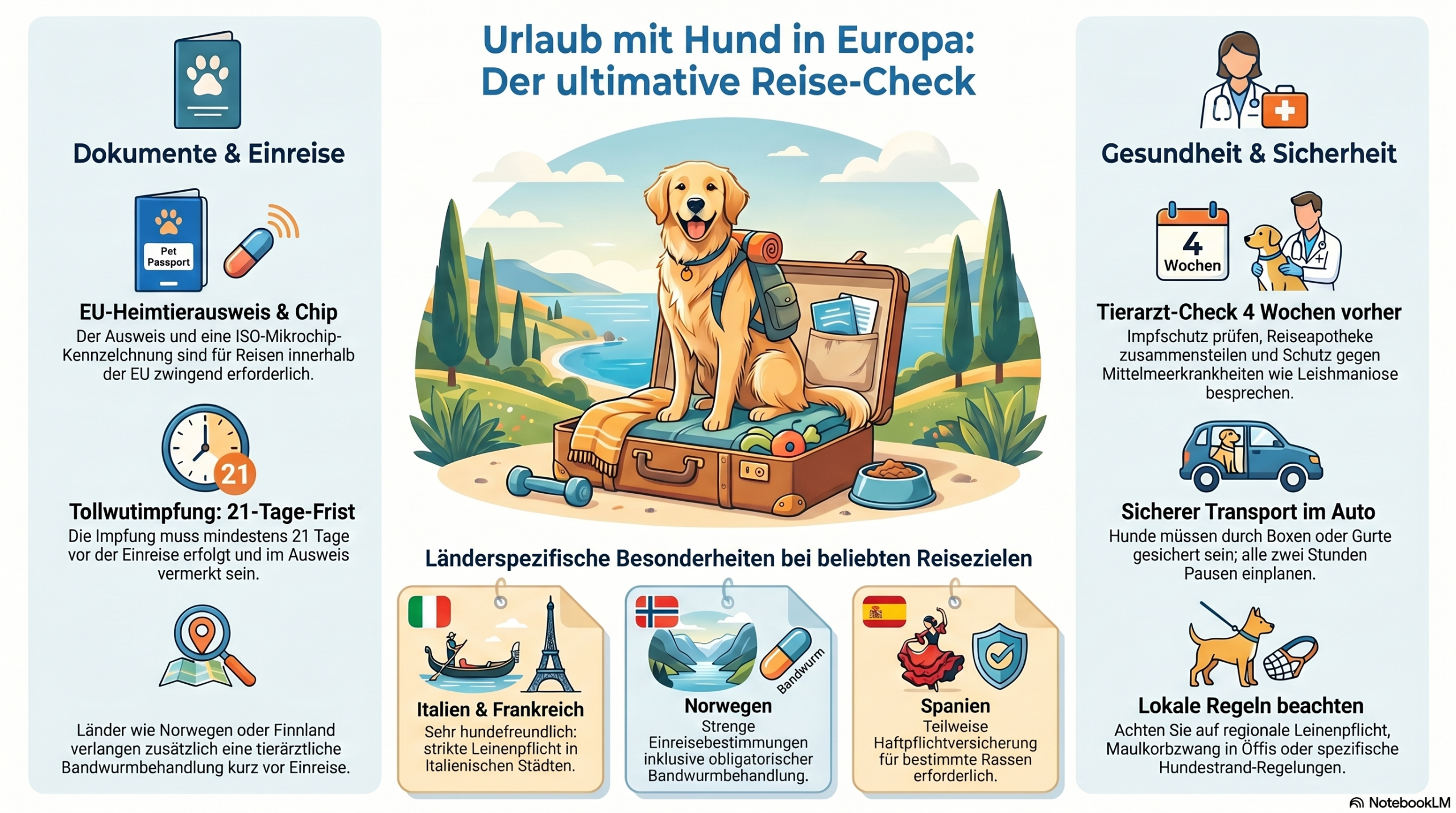 Der Urlaub mit dem Hund liegt im Trend. Immer mehr Tierhalter möchten ihren Vierbeiner nicht in einer Tierpension zurücklassen, sondern gemeinsam mit ihm neue Orte entdecken. Europa bietet dafür traumhafte Möglichkeiten – von den Stränden Kroatiens über die Berge Österreichs bis zu den Lavendelfeldern der Provence. Damit der Urlaub für Mensch und Hund zum Erlebnis wird, gilt es jedoch einiges zu beachten.